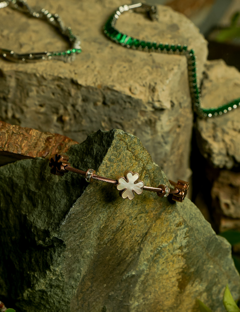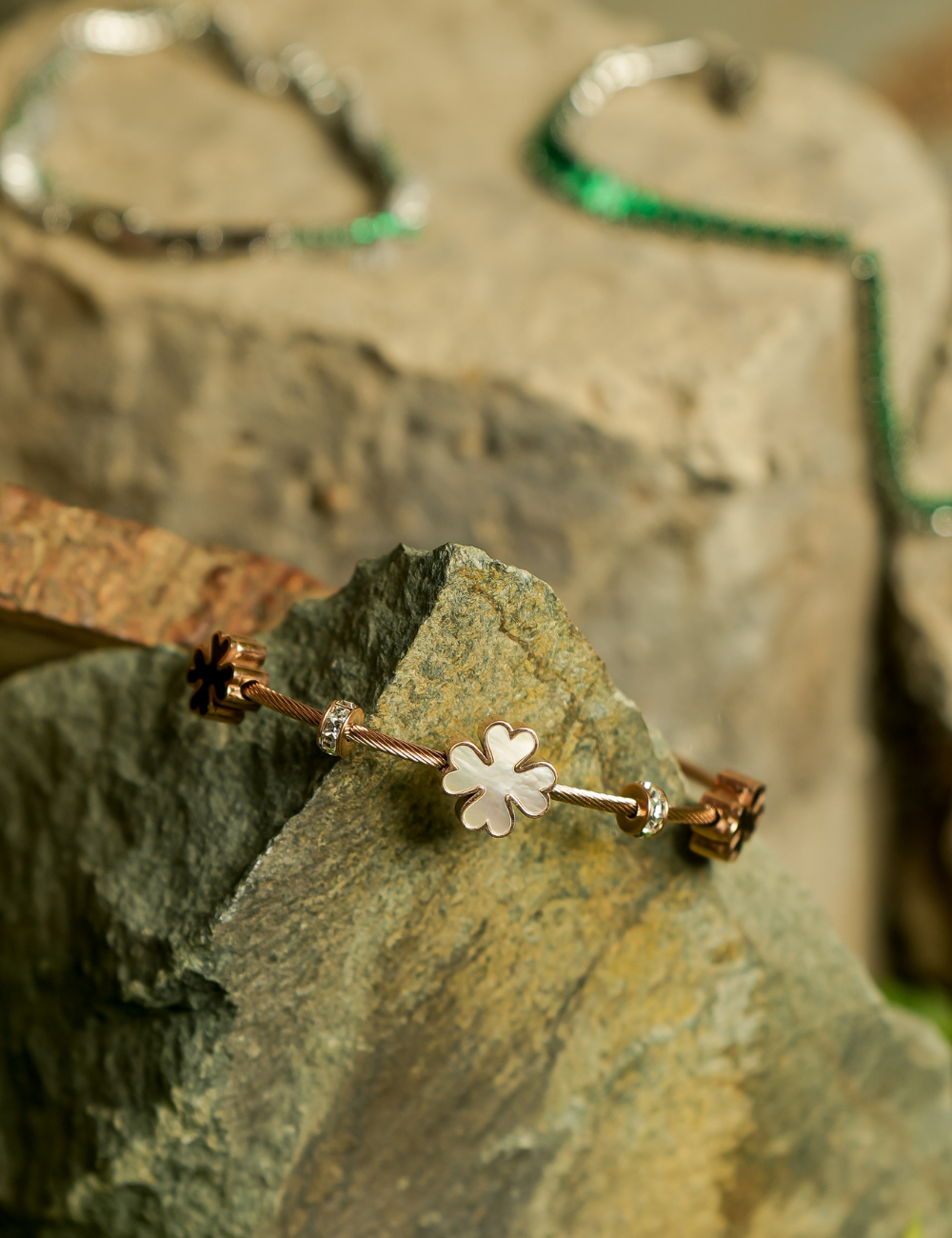 Channel your inner goddess with the Floral Rose Gold Wristlet, a timeless piece that blends modern luxury with traditional elegance. The rose gold tone is beautifully accented with delicate Mother of Pearl, creating a soft, ethereal glow. Radiant Zirconia crystals add a touch of refined sparkle, making this wristlet the perfect accessory for both casual and formal occasions.